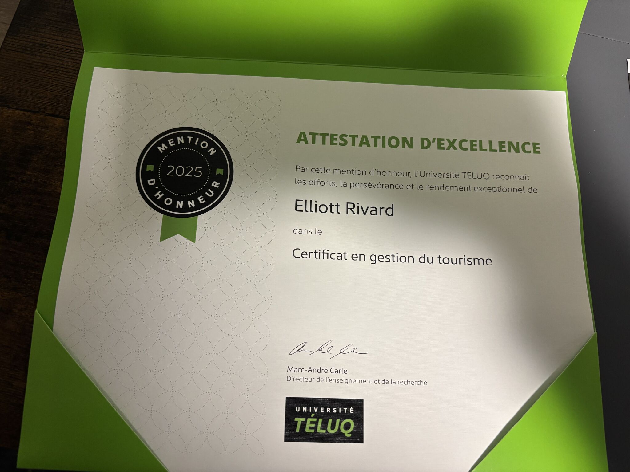 Passionate about the tourism industry and with four years of experience as a night auditor at hotels in Victoriaville, I am currently pursuing a Business Administration degree with a specialization in Tourism Management. My professional journey has allowed me to develop strong skills in operational management, customer service, and financial analysis, while enhancing my ability to work efficiently in dynamic and demanding environments. By combining this hands-on experience with rigorous academic training, I am determined to actively contribute to the development and promotion of tourist destinations, with a focus on operational excellence and strategic innovation.